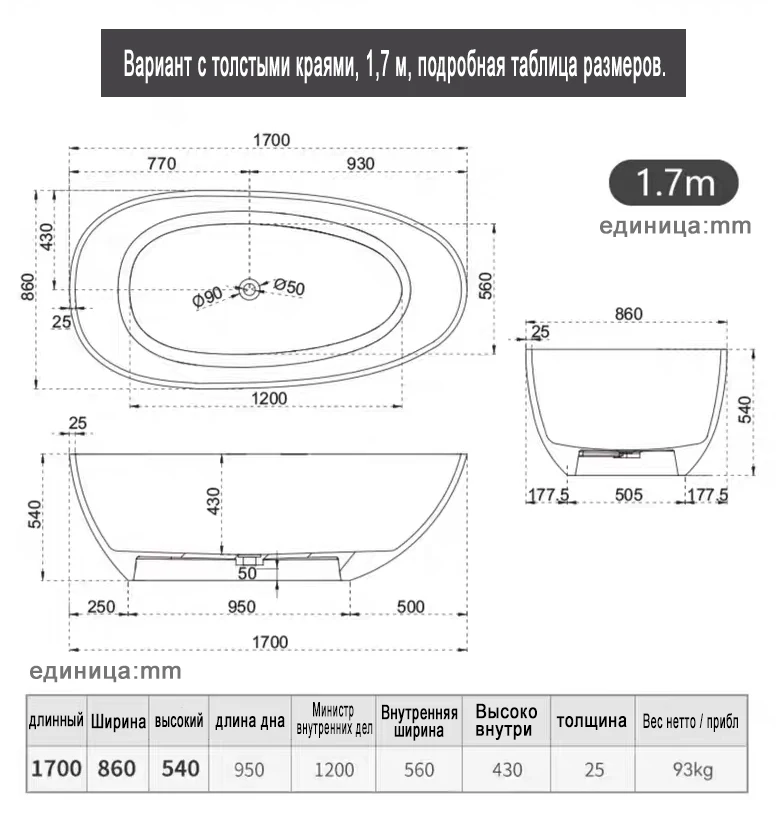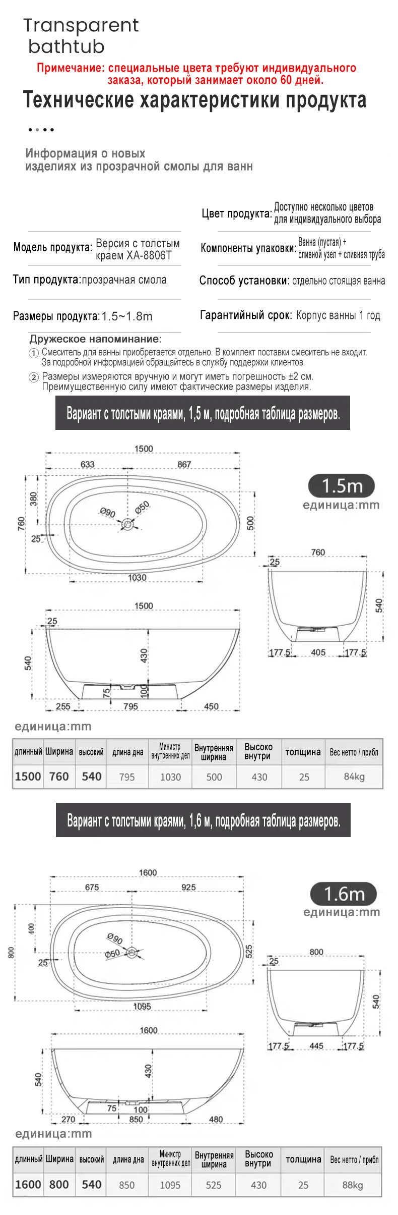 Ванна MEISHIDA-8806T, полиэфирная смола
