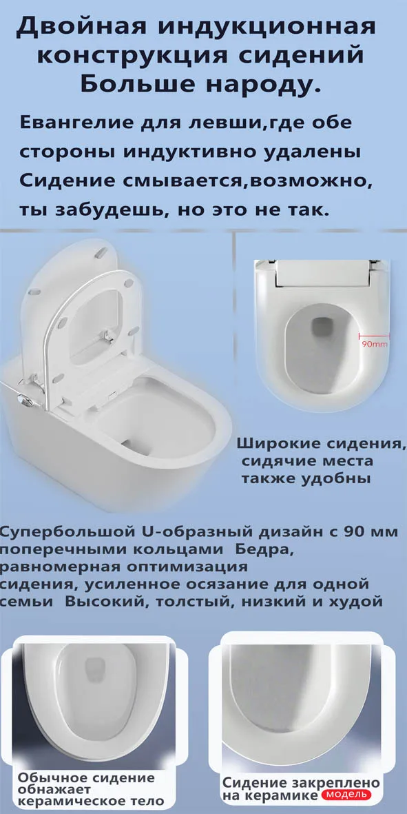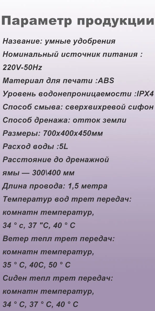 Унитаз умный MEISHIDA-9917B, 70см, автомат, насос, пенаВ избранноеВ сравнение ОсновныеТорговая маркаMEISHIDAНаправление выпускаВ стену (Р-Тrар)ОпцииАвтоматическое поднятие крышки, Ультрафиолетовая стерилизацияБачокС баком и компрессоромПенообразовательВстроенныйВсе характеристики 47 999 ₽ 59 999 ₽ -21% Фабрика (Китай): В наличии FBO / СВХ Приморье (для отправок по РФ): В наличии FBS / Красноярск: по запросу – + Купить ОбзорХарактеристикиОтзывы (0) ALIEXPRESS ОсновныеТорговая маркаMEISHIDAНаправление выпускаВ стену (Р-Тrар)ОпцииАвтоматическое поднятие крышки, Ультрафиолетовая стерилизацияБачокС баком и компрессоромПенообразовательВстроенныйКнопка управления ногойМикроволноваяПульт управленияБез дисплеяНапряжение220 ВМощность1350 ВтВлагозащитаIPX4Длина70 смЦветБелыйВес без упаковки45 кгПроизводствоКитайГарантия производителя12 мес.Отзывов нет
